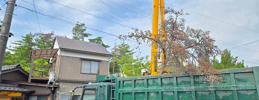 木に登り少しづつ伐り、クレーンで吊り上げての作業です。